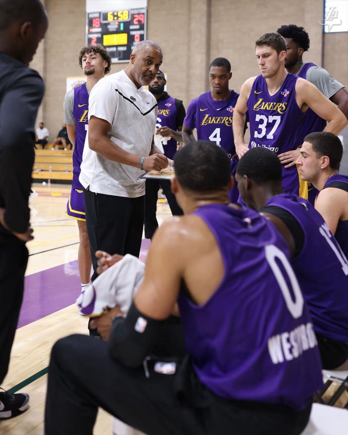 在今天的公开训练赛中,詹姆斯和威少都是身穿紫色球衣,他们两人同一队,和他们同队的还有达米安-琼斯、纳恩和斯威德;浓眉参加了训练,但他没有在媒体面前出战对抗赛。