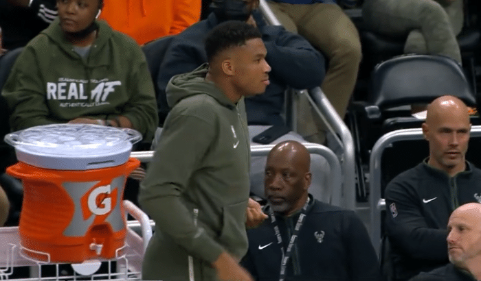 今天雄鹿和灰熊两队的当家球星字母哥和莫兰特都坐在场边观战,字母哥狂吃零食十分抢镜。