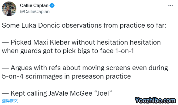 另外在独行侠训练营,后卫和大个子球员练习1对1时,东契奇更想搭档克莱伯;训练赛中了,东契奇十分认真,甚至与裁判就移动掩护进行了争论。