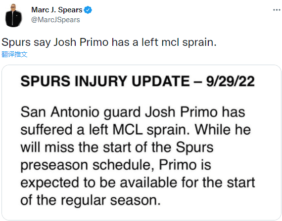 24直播网09月30日,马刺官方宣布,球队二年级后卫约什-普里莫在训练营中遭遇左膝内侧韧带扭伤,将至少缺席初段的季前赛,他的伤势并不算严重,马刺预计普里莫将在常规赛初期复出。