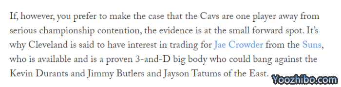 对于骑士有意引援克劳德,Joe Vardon表示:如果你更倾向于认为骑士距离真正的冲冠球队还差一个球员的话,那么证据就在小前锋的位置上,这就是骑士有意从太阳交易得到克劳德的原因,他是一个成熟的3D球员,可以用来在东部对抗杜兰特、吉米-巴特勒和塔图姆。