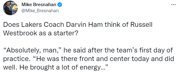 记者问湖人主教练哈姆威少新赛季会首发吗?哈姆回答:绝对的,威少今天在前锋和中锋位置,表现很好,他带来了很多能量。