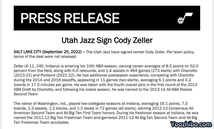 今夏泽勒一直无人问津,最终重建中的爵士给了他回归NBA的机会,接受训练营合同,冲击一份NBA正式合同;泽勒29岁,作为一名乐透秀,这本该是他生涯最好的年龄,却沦落到连一份正式合同都拿不到。