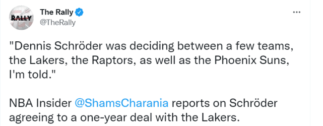 24直播网09月17日,名记Shams报道称,施罗德计划和湖人签下1年264万美元的合同,再次为这支球队效力,为此他拒绝了猛龙太阳等队的邀请。施罗德本人也第一时间更新社媒,重回湖人后首次发声。名嘴Bill Simmons依然看衰湖人前景,认为得到施罗德湖人也只是西部9号种子。