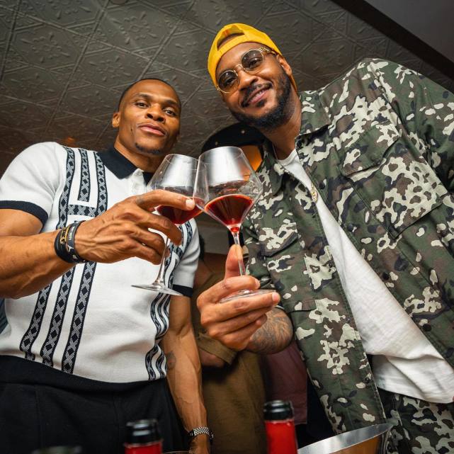 24直播网09月14日湖人球星威少亮相位于纽约的Vin Sur Vingt酒吧,为安东尼的红酒品牌VII(N) 捧场。安东尼晒出的动态中,威少和甜瓜碰杯合影,威少还拿着红酒冲着镜头说:“我为我的兄弟Melo而来,祝贺你,Melo,坚持你所做的事,这瓶我就带走了。干杯!”