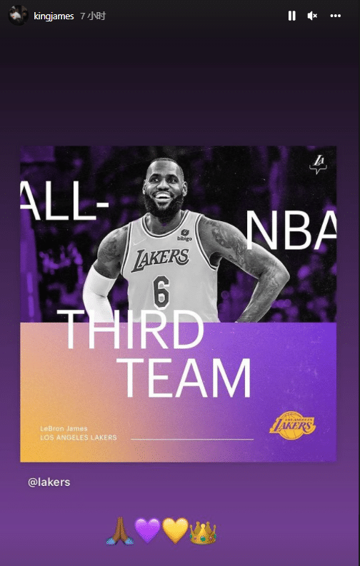 24直播网05月26日讯 湖人球星詹姆斯更新社交媒体,转发湖人官媒动态,庆祝自己入选最佳三阵;老詹先是转发湖人庆祝他入选最佳三阵的动态,配上爱心和王冠表情;湖人官方晒詹姆斯本赛季隔扣乐福、轰进三分以及大帽对手的精彩画面,并写道:史上第一位第19个赛季入选最佳阵容的球员,为国王欢呼!