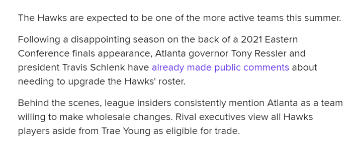 24直播网05月25日讯,据露天看台记者Jake Fischer报道,老鹰有望成为今夏在交易市场上最活跃的球队之一;联盟内部人士透露,老鹰是一支愿意进行大规模改变的球队。竞争对手的高管认为,除了特雷-杨之外,老鹰所有的球员都可以被交易。