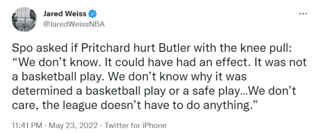 “我们不知道(那动作和巴特勒受伤是否有关),”斯波说,“可能会有些影响,这不是一个篮球动作,我们不确定为什么它会被认为是一个篮球动作,或者是一个合理安全的动作。我们不会夸大动作本身,因为我们不知道是不是这个动作导致巴特勒的伤病……我们不在乎,也不需要联盟做任何事。”