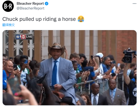 59岁查尔斯-巴克利真会来事,戴着西部牛仔帽、穿着西装、骑着一匹马亮相,两旁挤满了独行侠球迷;巴克利用这样的特殊的方式支持独行侠,不过下马的样子有些狼狈,一条腿卡住了,在别人的帮助下,才艰难下马,此时奥尼尔等人哈哈大笑。