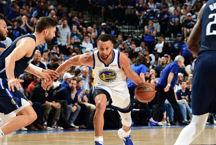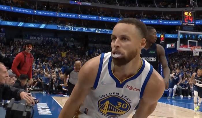 第二节,勇士和独行侠打得十分胶着,打着打着库里突然开火,迎着防守轰进三分,之后三分出手提前转身庆祝,球进反超比分,直接打停独行侠,此时库里吐舌疯狂庆祝,随后扑防时被场边人员绊倒;半场打完库里拿到16分5助攻4篮板;值得一提的是,波特第二节受伤退赛,格林不满被吹回场违例吃到技犯。