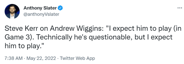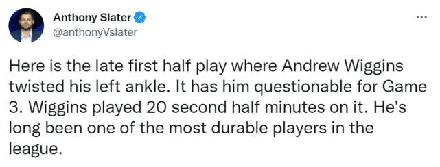 24直播网05月22日讯 ,西决G3的伤病报告上,维金斯左踝酸痛,被列为questionable(出战成疑,上场可能性50%)。勇士跟队记者Slater也晒出了维金斯受伤的一幕。他在G2上半场还剩2分24秒时扭到了左脚。