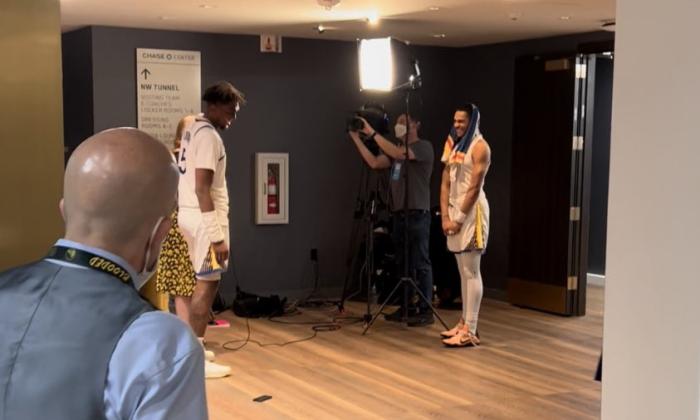 西决G2赛后,东契奇沮丧离场,轰下42分8助攻5篮板以及末节14分仍惨遭逆转,美媒疯狂恶搞东契奇输球;勇士队则是疯狂庆祝,普尔“猛拍”库里胸口,随后两人拥抱击掌庆祝;返回更衣室途中,勇士工作人员为库里欢呼,库里还在更衣室楼梯口高呼:加油!