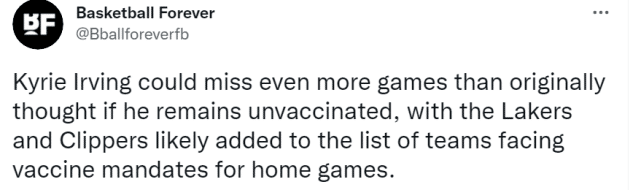名记斯坦恩转发报道后写道:“看来湖人和快船很快要面临和篮网、尼克斯、勇士一样的疫苗规定。”这意味着,如果欧文不接种疫苗,他不但打不了篮网的主场比赛,还打不了勇士、尼克斯、湖人和快船的客场比赛。