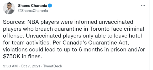 24直播网10月07日讯,据名记查拉尼亚报道,加拿大的防疫规定非常严格,在多伦多打球时,未接种疫苗的NBA球员只能在参加球队集体活动时,才会被允许离开酒店。如果球员违反规定,私自离开酒店,将被处于最高6个月的监禁以及75万美元的罚款。