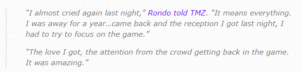 接受美媒TMZ采访,35岁朗多表示:昨晚我差点又哭了,(重返湖人)这意味着一切。我离开了一年,然后又回来了,昨晚我得到了接待,我必须努力专注于比赛;我得到了爱,球迷又回到了球馆中,这真是太棒了。