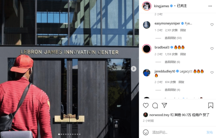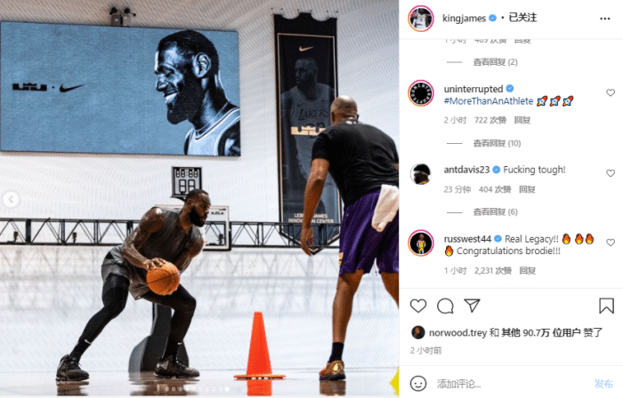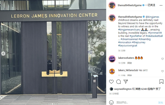 詹姆斯晒位于耐克总部的个人中心引热议,篮网巨星杜兰特在评论区留言:FYE...(语气词);奇才球星比尔回复三个火的表情,湖人旧将杜德利:成就!!!太火了。