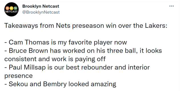 24直播网10月04日讯 篮网123-97大胜湖人,取得了季前赛的首场胜利。双方均有多名核心缺阵,对于篮网而言,这场大胜没有什么实质意义,但美媒Brooklyn Netcast指出球队还是有四大收获。