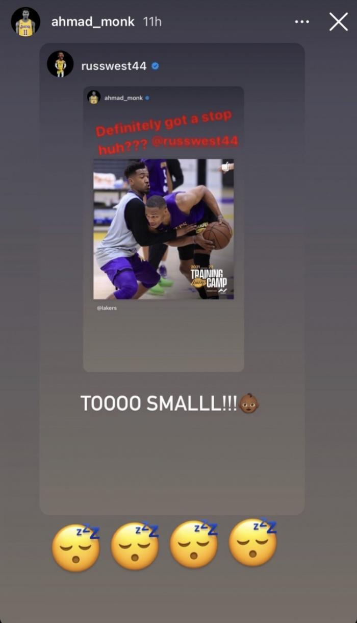 威少与蒙克趣味互动,官方晒出训练视频其中有一张蒙克防威少的图片,蒙克在自己的社交媒体上晒出了这张图片并“叫嚣”威少:我绝对把你拦下来了哈@威少。威少“不甘示弱”转发回应:太小了!!!队友之间的有爱互动,季前赛即将开打,据沃格尔爆料詹姆斯威少、阿里扎和安东尼都不会出战季前赛,另外浓眉也只会打很少的时间!
