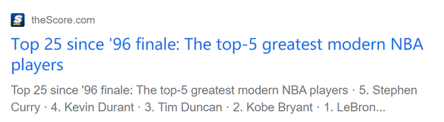 24直播网10月02日讯 过去25年,NBA出现过不少巨星级的人物。近日,美媒theScore评选了近25年的25大巨星,并在10月2日公布了最终前五的排名。詹姆斯高居榜首,科比排名第二,位居第三至五位的依次是邓肯、杜兰特和库里。(注:这是theScore基于NBA50大巨星的延伸,所以没有乔丹、奥尼尔等已经在那份榜单上的球星。)