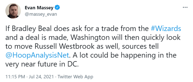 NBA记者Evan Massey报道称,如果比尔向奇才提出交易申请,并最终离开,奇才会马上交易威斯布鲁克。他们下赛季的阵容可能迎来巨变。