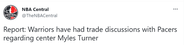 24直播网讯 北京时间7月24日,据The Ringer名记凯文-奥康纳报道,勇士已经和步行者进行谈判,商讨关于步行者中锋迈尔斯-特纳的交易。奥康纳透露,步行者正在向多支球队兜售特纳。