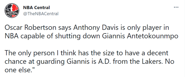 24直播网讯 北京时间7月23日,雄鹿名宿奥斯卡-罗伯特森在接受电台采访时,谈到了刚刚夺冠和当选FMVP的字母哥。罗伯特森认为在当今联盟里,只有一名球员有能力阻挡字母哥,他就是湖人球星安东尼-戴维斯。