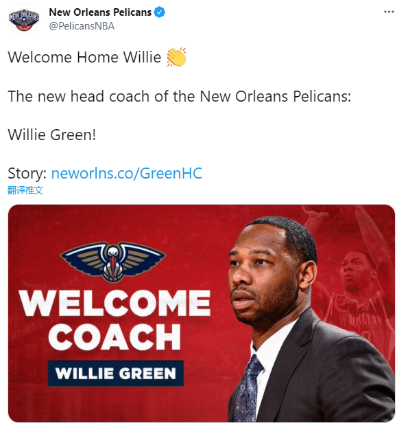 24直播网讯 北京时间7月23日,新奥尔良鹈鹕正式官宣新教练,晒照并且发推写道:欢迎威利回家,鹈鹕队新主帅,威利-格林!