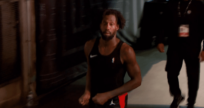 第三节保罗和考辛斯发生身体接触,考辛斯双手抱球,肘部有一个小动作,随时保罗捂着肩膀倒地不起,然后露出笑容,最终考辛斯吃到技犯,对此考辛斯一脸无辜,翻白眼十分不满。