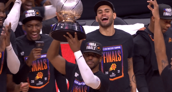 晋级之后,保罗直言赢得西部冠军的感觉太棒了,然后迫不及待地结束采访,然后和队友一起庆祝,戴着西部冠军的拥抱众队友,以及与主帅、队友等人合影;保罗第一个捧起西部冠军奖杯,然后递给太阳主帅。