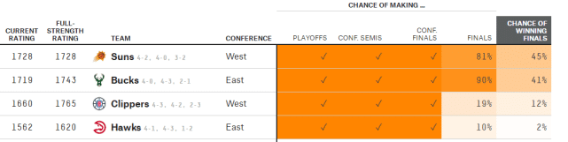 上场输给快船之后,太阳的晋级概率下降到了81%,夺冠概率也来到了45%。此番字母哥受伤之后,太阳的夺冠概率已经到了50%。