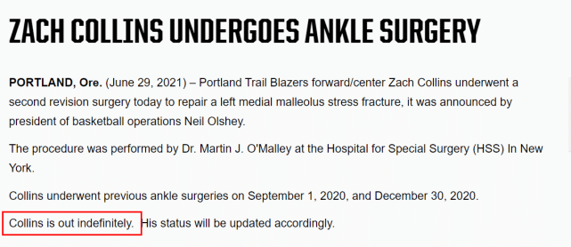 24直播网讯 北京时间6月30日,开拓者官方宣布,扎克-科林斯已经再次接受手术,修复左踝应力性骨折,去年,他的同一个脚踝也遭遇了应力性骨折。科林斯将无限期休战。这次手术是由纽约医学专家马丁-奥马利完成的,此前,为杜兰特进行跟腱手术的也是这位医生。