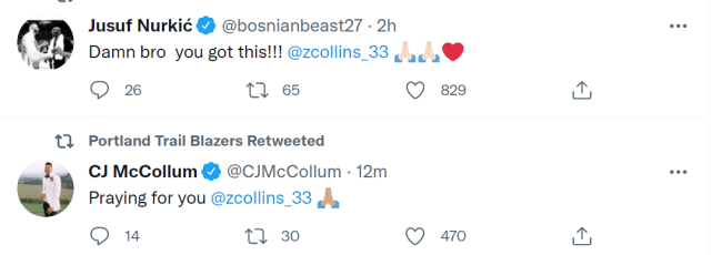 科林斯再次骨折的消息出来后,队友努尔基奇和麦科勒姆都更新了社媒,为他祈祷,祝福他早日康复。