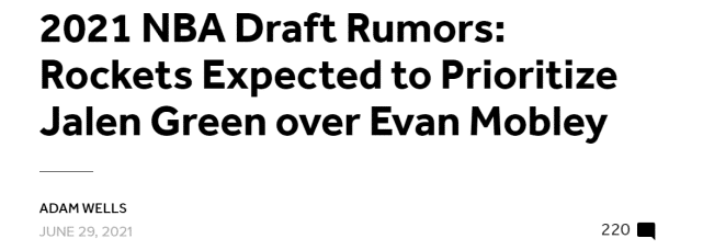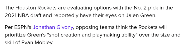 选秀专家乔纳森-吉沃尼报道称,不少球队的高管都认为火箭会优先考虑杰伦-格林“创造投篮和组织进攻的能力”,而不是埃文-莫布里的身高和技术。