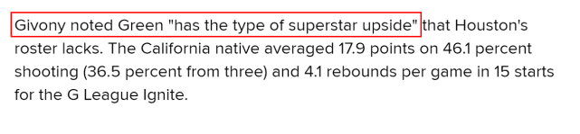 格林上赛季打了G联赛,场均17.9分4.1篮板,投篮命中率46.1%,三分命中率36.5%。吉沃尼认为格林有潜力成为一位超级巨星,而这正是目前火箭阵容中所缺少的球员。