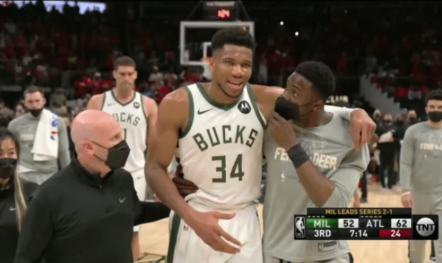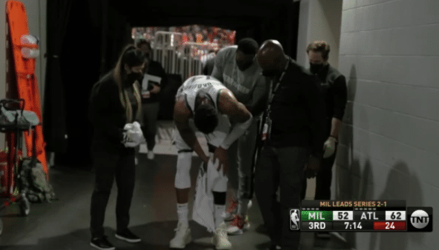 24直播网讯 6月30日,NBA季后赛东部决赛G4老鹰继续在主场迎战雄鹿,这场比赛进行到第三节还剩下7分14秒的时候,字母哥落地的时候左脚膝盖反关节扭了一下,随后字母哥下场,他在哥哥的搀扶下来到了球员通道,随后自己走着短暂回到更衣室。球员通道中的字母哥一度拄着膝盖,他慢慢的走出球场,不过很快他就回到场边。字母哥受伤下场之际老鹰打了个12-2,瞬间将优势拉大到20分。