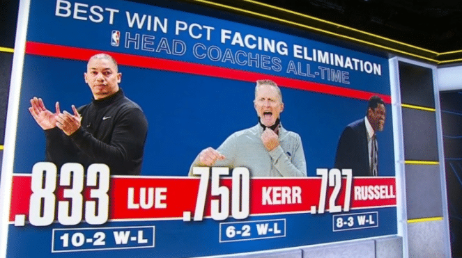算上今天,泰伦-卢的球队在季后赛中面临被淘汰的比赛中, 总计取得了10胜2负的战绩,这在所有的至少面对10场这样比赛的58位教练中,胜率排名第一。