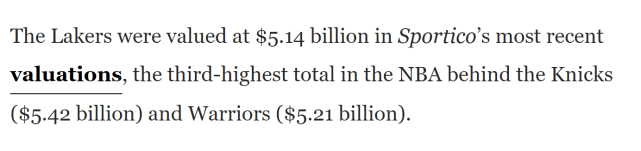 根据Sportico的最新估值,湖人的市场估值是51.4亿美元,仅次于尼克斯(54.2亿)和勇士(52.1亿),位居联盟第三位。