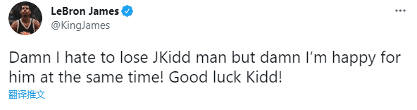 基德执教独行侠之后,湖人当家球星勒布朗-詹姆斯发声,老詹表达内心的无奈情绪,并祝贺基德,他发推写道:该是,我讨厌失去基德,但与此同时我也为基德而开心!祝你好运,基德!