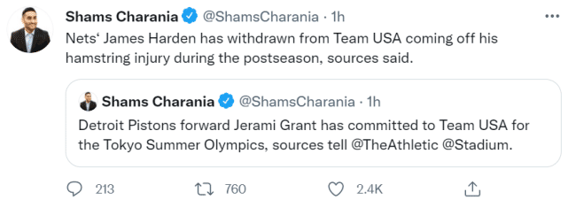 24直播网讯 北京时间6月24日,据NBA名记查拉尼亚报道,美国男篮的奥运会12人名单已经出炉。公牛球星拉文将加入球队,哈登因腿筋伤势退出,活塞的杰拉米-格兰特顶替哈登入选。