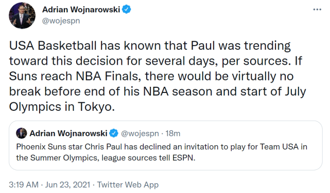 24直播网讯 北京时间6月23日,据名记沃纳罗斯基报道,太阳球星克里斯-保罗已经拒绝了美国男篮的邀请,将不会参加今年夏天的东京奥运会。如果太阳打进总决赛,保罗的体能会受到严峻的考验,因为NBA赛季结束和奥运会开始之间没有休整的时间。