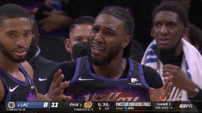 快船和太阳西决G2,两队球员之间的身体接触明显更多,克劳德、布克和贝弗利都早早吃到两次犯规;面对如此高强度的防守,乔治首节大部分时间的进攻手感都很糟糕,第一节7中2拿到5分;本场比赛,小卡和保罗都是再次缺席比赛,乔治再次对阵布克,两队打出一场单节得分很低的防守大战,首节快船22-25落后太阳3分。