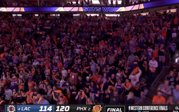 当第四节结束的哨音吹响后,太阳主场球迷陷入狂欢。他们不断挥舞手中的毛巾,将球馆变成了欢乐的海洋。上一次他们体验到西决胜利的快乐,还是在2010年。而现在他们的目标更加远大,他们正在向28年来首次NBA总决赛之旅迈进!