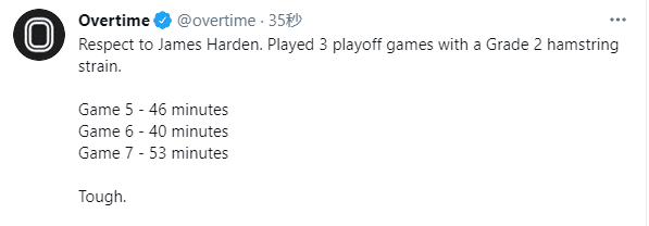 哈登带伤连续打了三场比赛——G5天王山出战46分钟10投1中仅5分6篮板9助攻,G6出战40分钟9中5拿到16分5篮板以及抢七大战苦战53分钟,17投5中22分9篮板9助攻;为了帮助杜兰特以及篮网,哈登提前带伤复出,职业精神令人动容,不过哈登带伤出战的状态并不好。