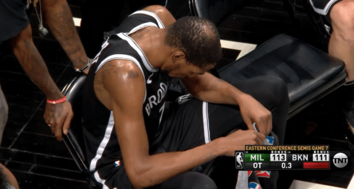 24直播网讯 北京时间6月20日,篮网主场加时惜败雄鹿,杜兰特全场打满53分钟轰下48分9篮板6助攻仍遗憾出局,加时赛0分以及关键三分三不沾,死神筋疲力竭真累了;哈登带伤出战同样尽力了,赛后哈登透露自己的真实伤情,并不是腿筋紧张,而是腿筋二级拉伤。