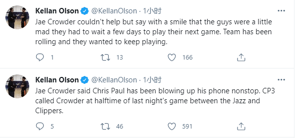 太阳悍将克劳德透露保罗非常想要打球,他一直在不停地给我打电话,在昨天快船VS爵士的中场他也给我打了电话;克劳德还调侃需要等好几天才能打西决,全队都有点憋疯了,我们都迫不及待地想继续比赛。
