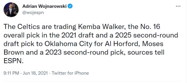 24直播网讯 北京时间6月18日,据ESPN名记沃纳罗斯基报道,凯尔特人和雷霆达成了一笔3换3的交易,凯尔特人送出肯巴-沃克、2021年的首轮16号签和2025年的次轮签,得到雷霆的艾尔-霍福德、摩西-布朗和2023年的次轮签。