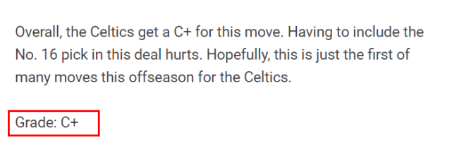 美媒为史蒂文斯的这笔操作,打出了C+的分数,搭上一个首轮签有点受伤。他们认为史蒂文斯的运营风格,或许会让绿军球迷耳目一新,因为安吉有太多“几乎要完成的交易”,而史蒂文斯行事比安吉更加果断,只要机会出现,他会毫不犹豫地采取行动。