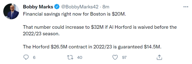 薪金专家鲍比-马克斯随后解析了这笔交易,凯尔特人目前通过这笔交易,可以节省2000万美元。如果他们选择在2022-23赛季之前裁掉霍福德,节省的数字将达到3200万美元。霍福德在2022-23赛季的薪水是2650万美元,但其中保障部分是1450万。