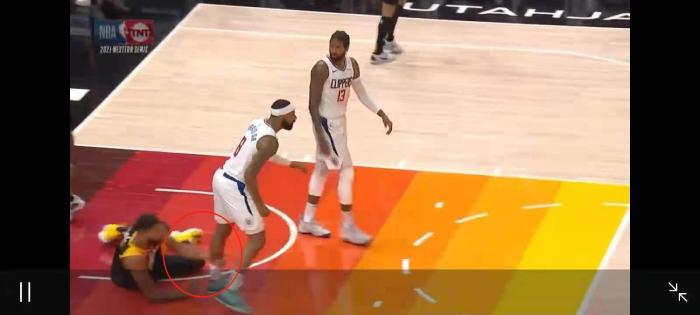 但是或许是因为比分的落后,在第二节比赛还剩下2分钟左右的时候,小莫里斯的举动就非常的不理智。场上,乔治篮下强打,戈贝尔倒地,乔治上篮得分。在转身准备回防的时候,小莫里斯注视着地板上的戈贝尔,然后上演“跨栏”,给了戈贝尔胯下之辱。