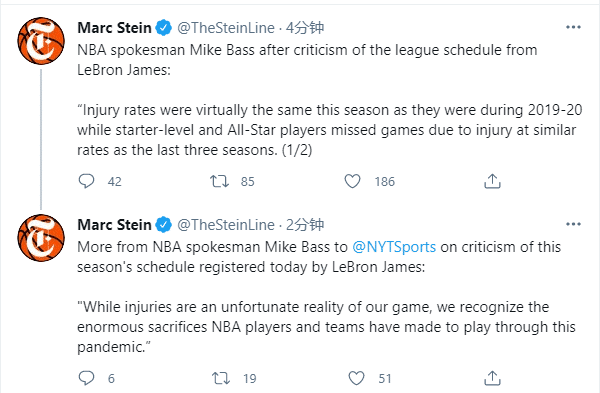 联盟发言人迈克-巴斯表示:本赛季的伤病率与 2019-20赛季几乎相同,而首发球员和全明星球员因伤缺席比赛的几率与过去三个赛季相似;虽然比赛中出现了不幸的伤病,但我们知道NBA球员和球队在这次疫情中都做出的巨大牺牲。